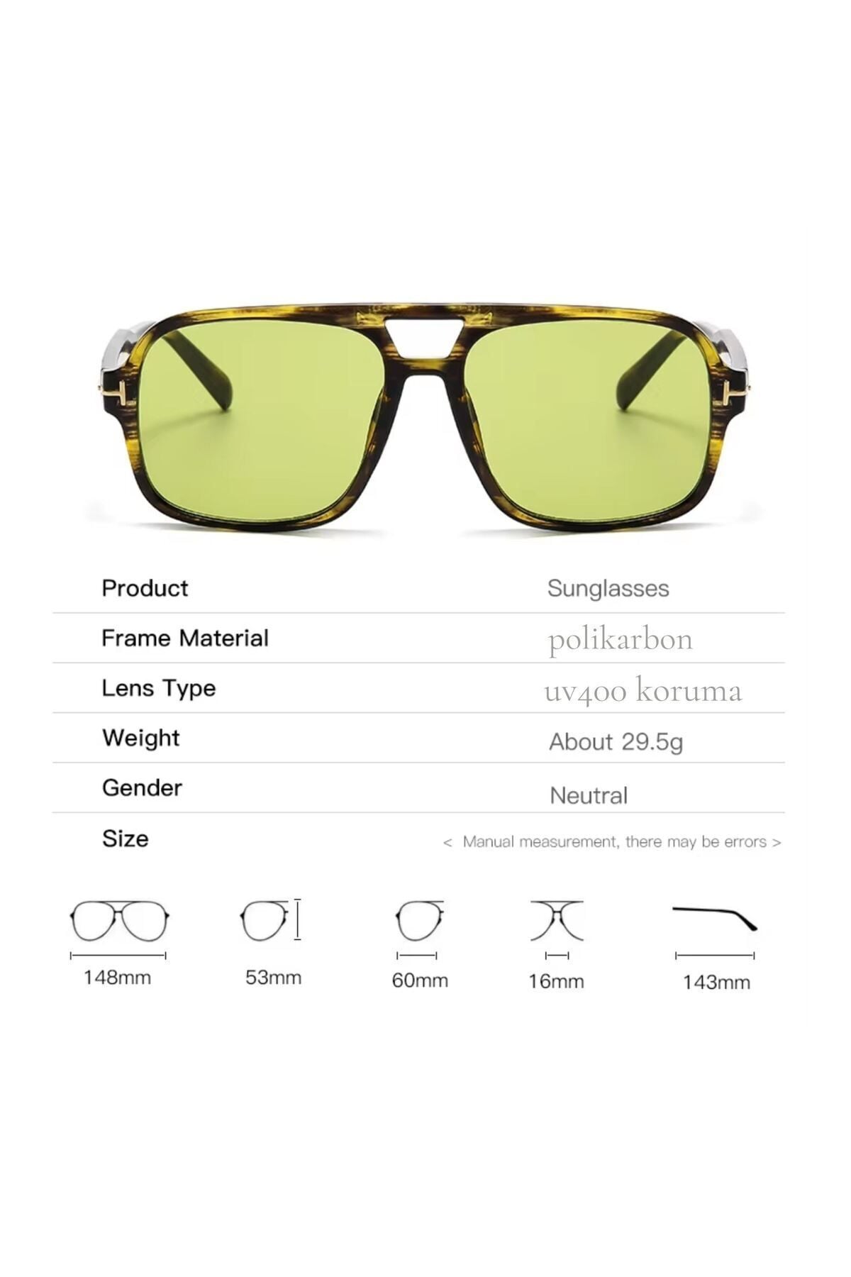 Fancy güneş gözlüğü ile sıradanlığa meydan okuyun! 70'lerin efsanevi pilot gözlüğü tarzını günümüze taşıyan bu eşsiz tasarım, tarzınıza hem nostaljik hem de modern bir dokunuş katacak.; Göz alıcı renkleri ve cesur çizgileriyle Fancy, sadece bir güneş gözlüğü değil, aynı zamanda kişiliğinizin en çarpıcı yansıması olacak.; Fancy'nin Özellikleri Neler? Efsanevi Tasarım: 70'lerin ikonik pilot gözlüğü tarzı, modern detaylarla yeniden yorumlandı.; Bu sayede hem nostaljik hem de çağdaş bir görünüm elde edeceksiniz.; Kristal Netliğinde Görüş: UV400 lensler, yansıyan ışığı engelleyerek gözlerinizi korur ve size kristal netliğinde bir görüş sunar.; Güneşli günlerde bile gözleriniz yorulmadan etrafınızı keşfedin.; Tüy Gibi Hafiflik: Sadece 29.5 gram ağırlığıyla gün boyu rahat bir kullanım sunar.; Gözünüzde olduğunu bile unutacaksınız! Sağlam ve Dayanıklı: Yüksek kaliteli polikarbonat çerçeve, darbelere ve çizilmelere karşı üstün koruma sağlar.; Uzun yıllar boyunca ilk günkü gibi kullanabilirsiniz.; Her Yüze Uyum Sağlayan Unisex Tasarım: Hem kadınlar hem de erkekler için uygun olan bu model, her yüz şekline mükemmel uyum sağlar.; Fancy ile Tarzınızı Konuşturun! Fancy güneş gözlüğü, her ortamda dikkatleri üzerinize çekmenizi sağlayacak.; İster jean ve tişört ile casual bir görünüm yaratın, ister şık elbiselerle kombinleyerek daha sofistike bir tarz yakalayın.; Fancy, her zaman stilinizin en güçlü ifadesi olacak.;