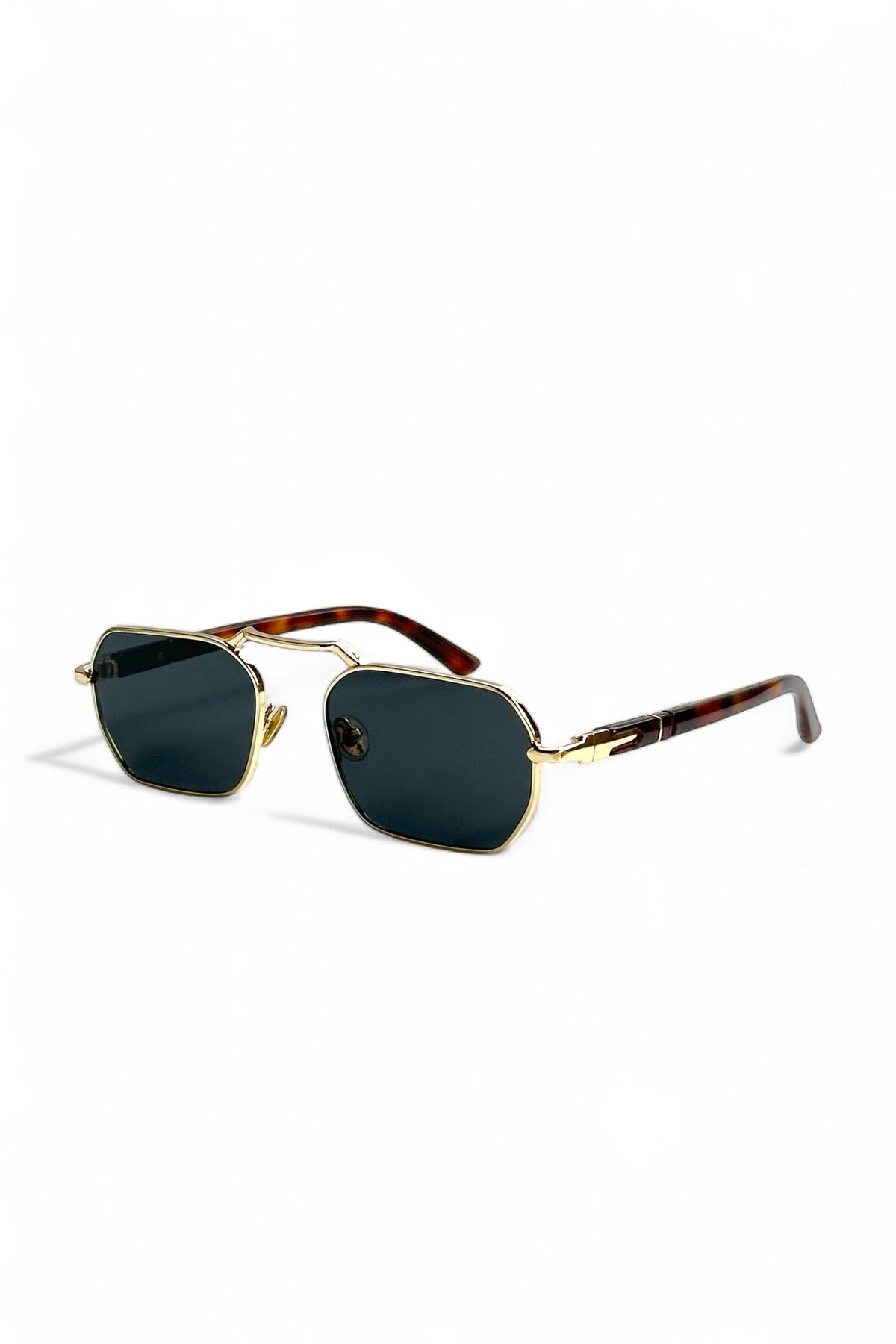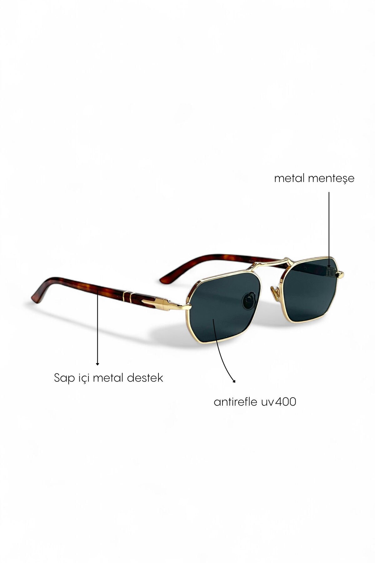 OCTO güneş gözlüğü, cesur dikdörtgen formu ve lüks altın metal çerçevesiyle bakışları üzerinize çekecek.; Sokak modasından klasik stile kadar her kombine kolayca adapte olan bu gözlük, hem erkek hem de kadın kullanıcılar için unisex bir stil ikonudur.; Neden OCTO'yu Tercih Etmelisiniz?Modern Köşeli Tasarım: Gözlüğün kendine has dikdörtgen/hafif sekizgen yapısı, yüzünüze modern ve keskin bir çizgi katar.; Sıradanlığın dışına çıkmak isteyenler için idealdir.; Altın & Tortoiseshell Şıklığı: Parlak altın rengi metal çerçeve, gözlüğe zengin bir görünüm katarken; saplarda kullanılan kahverengi desenli (tortoiseshell) asetat uçlar hem şıklığı tamamlar hem de gün boyu rahat bir kullanım sunar.; Güneşe Karşı Güçlü Koruma: Koyu füme renkli camlar, gözlerinizi kamaşmadan korur.; %100 UV Koruması (UV400) sayesinde güneşin zararlı ışınlarına karşı tam güvence sağlar.; Çift Köprü Detayı: Üst kısımdaki çift köprü (double bridge) detayı, modele pilot/aviator tarzı bir dinamizm ve retro bir hava katmaktadır.; EŞREF TEK ÖZEL GÖZLÜĞÜ